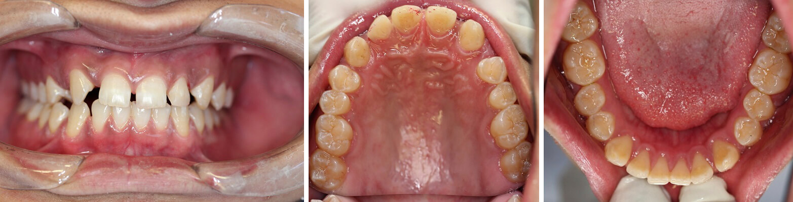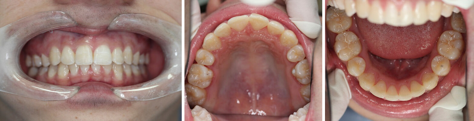 Orthodontic treatment with brace, followed by 1 implant to replace lower right molar and 4 porcelain veneers to improve the aesthetics of upper anterior teeth.