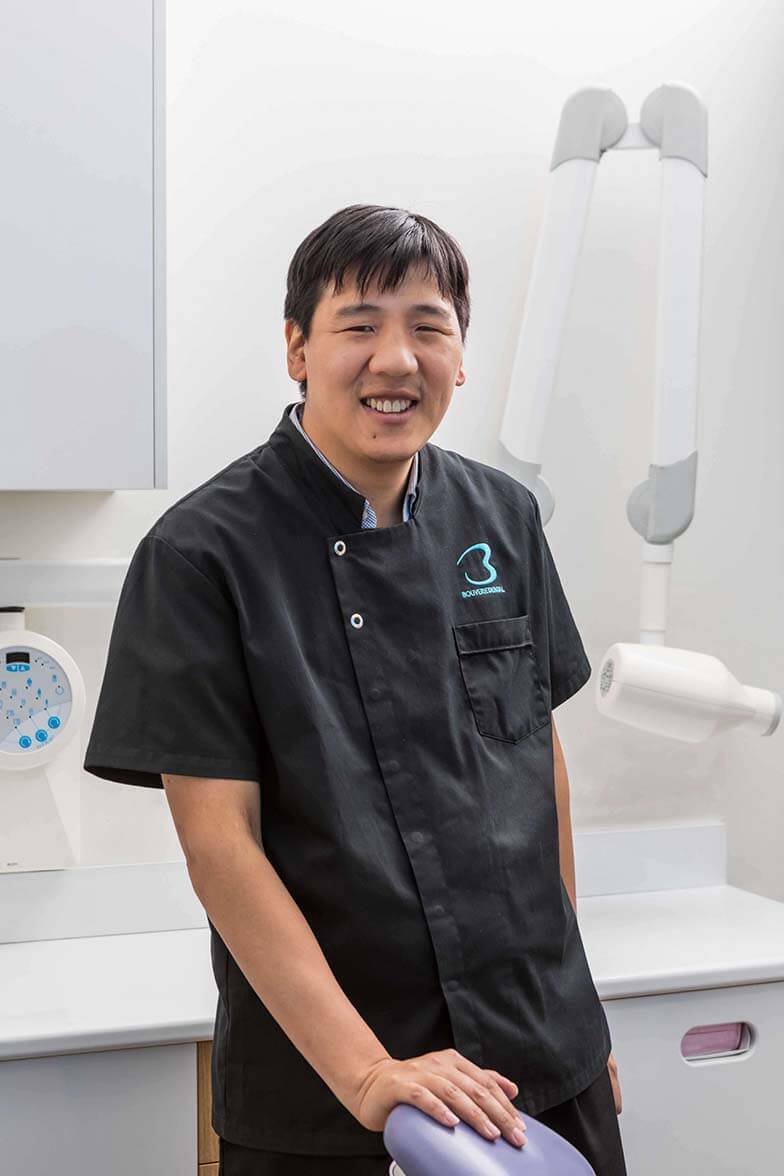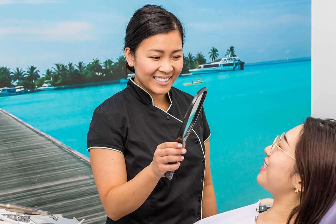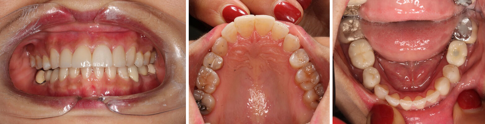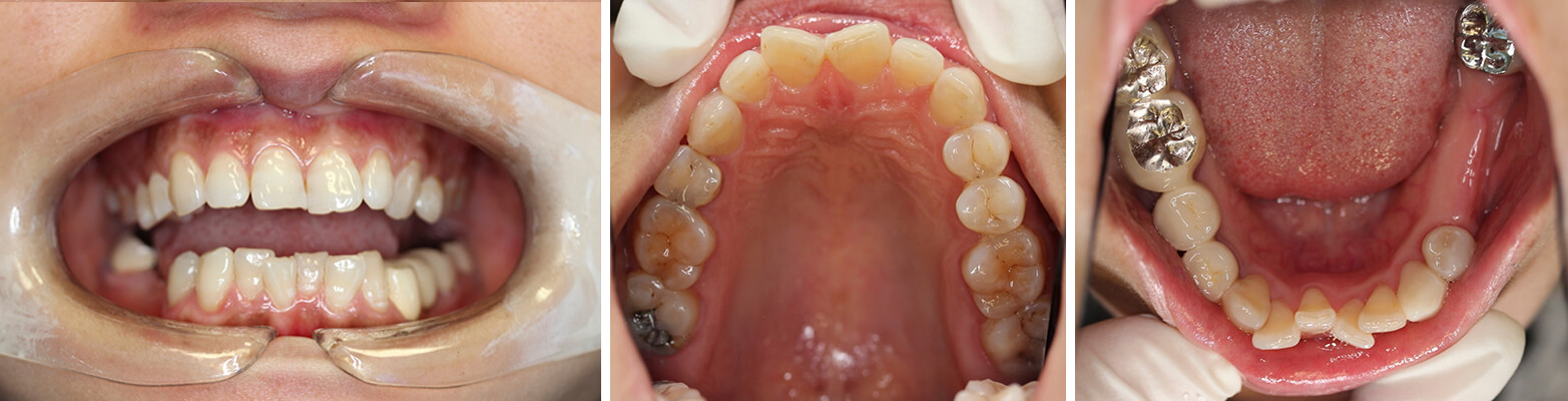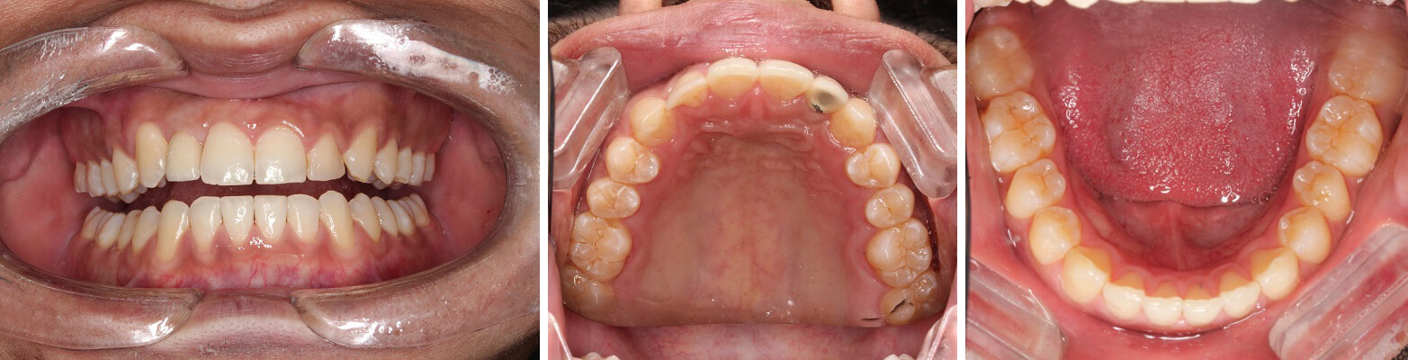 Orthodontic treatment with brace, followed by 1 implant to replace lower right molar and 4 porcelain veneers to improve the aesthetics of upper anterior teeth.